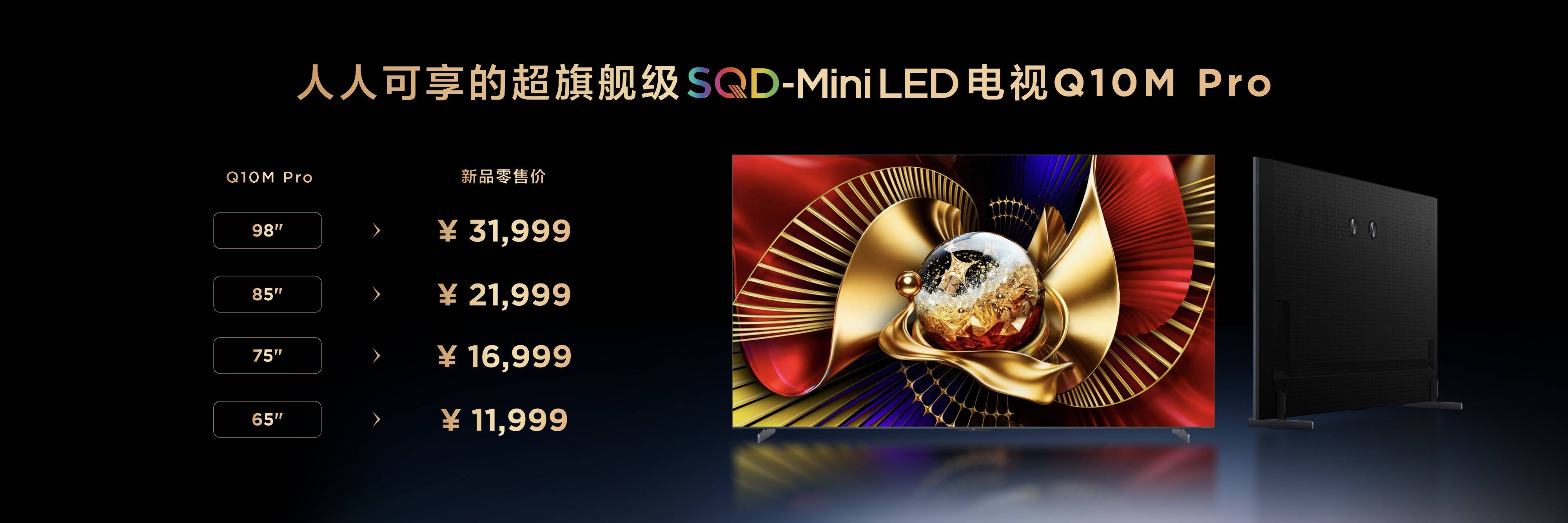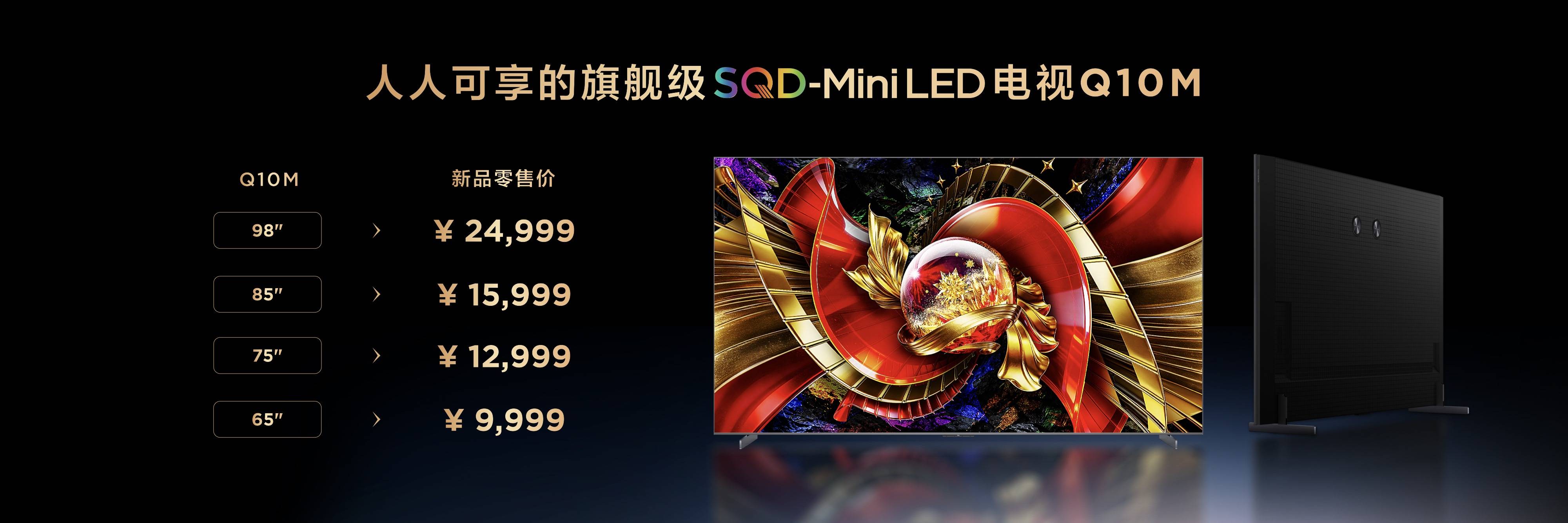 与此同时,人人可享的SQD-Mini LED旗舰级产品TCL Q10M也一并上市,同样搭载SQD-Mini LED技术,拥有碾压同价位产品的100% BT.2020全局高色域,配备最新的超级量子点技术,屏幕也直接一升到顶,配备超级蝶翼华曜屏,98吋、85吋、 75吋、65吋零售价分别为24999元、15999元、12999元、9999元。作为技术普惠的标杆之作,Q10M代表着TCL大幅降低了SQD-Mini LED体验门槛,让用户真正触手可及。